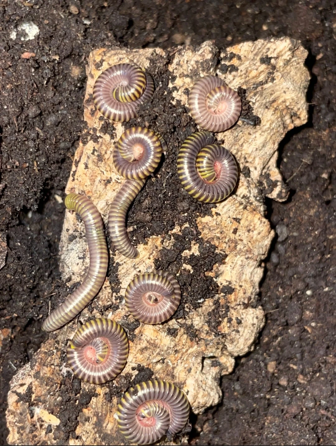 Often called Bumble Bee Millipede due to the yellow stripes on their black bodies, they naturally originate from the Caribbean but have been introduced to the southeastern United States. They feed on forest litter; in captivity, this consists of a mix of soil with leaves, wood rot, and calcium. Occasionally, you can also provide them with a juicy fruit or vegetable and dried protein food such as gammarus. They are very easy and trouble-free to care for, making them ideal for beginners in terrarium keeping. When disturbed, they emit an unpleasant-smelling secretion to deter predators. They grow up to about 6cm (2.36 in). These are completely harmless and beneficial arthropods. They can be successfully kept in a terrarium.