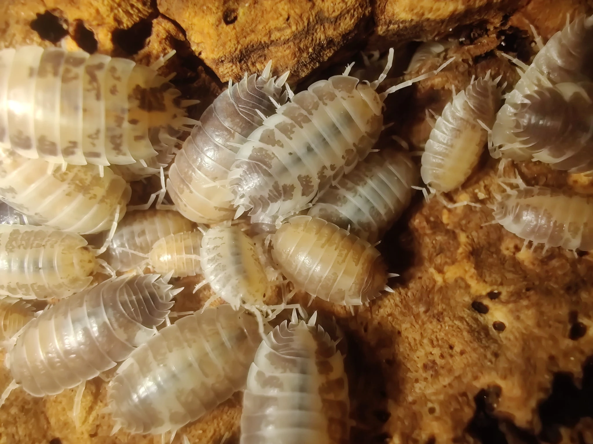 Easy-to-care-for isopods that reach a size of approximately 2 cm (around 0.8 inches). They are ideal as a cleaning crew, being both active and visually appealing. This color variation features chocolate-brown markings on their backs. They are perfect for beginner keepers and have the same care requirements as other Porcellio laevis.